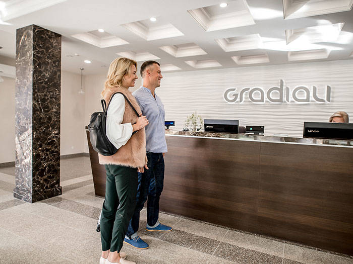 Visos procedūros sanatorijoje: inhaliacijos, vonios, povandeninis masažas ir baseinas - teikiamos su mineraliniu vandeniu! Taip pat „Gradiali“ sanatorijoje rasite: 2 buvietes pirmajame aukšte bei 1 biuvetę antrajame aukšte, šalia SPA procedūrų registratūros. (Prieš vartojant vandenį būtina pasitarti su gydytoju).