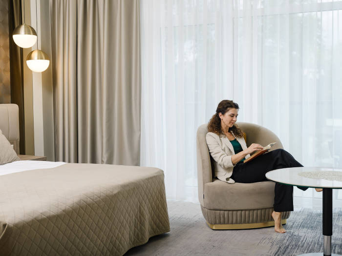 Įsikursite stilingame ir erdviame geresniajame dviviečiame kambaryje, kuriame rasite viską, ko gali prireikti patogiam Jūsų poilsiui: dvi atskiras lovas arba vieną dvigulę lovą, poilsio baldus, televizorių, kabelinę TV, WiFi, šaldytuvą, elektrinį virdulį, indus, oro kondicionierių. Taip pat turėsite atskirą vonios kambarį su dušo kabina, WC bei Jums paruoštais rankšluosčiais bei būtiniausiomis higienos priemonėmis.