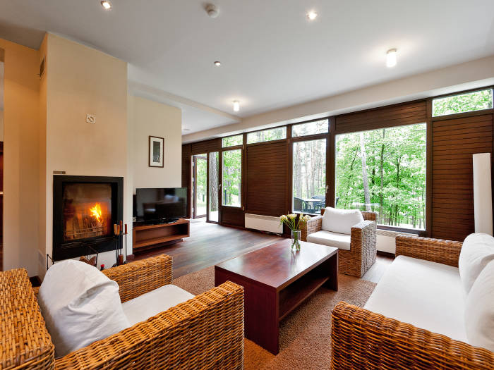 Privatus keturvietis dviejų aukštų namelis su židiniu - tai dviaukštis namelis su didele erdvia svetaine ir saulėta lauko terasa pirmajame aukšte bei dviem atskirais dviviečiais miegamaisiais antrajame namelio aukšte. Natūralios medžiagos, šiltos spalvos, jaukus apšvietimas ir dideli langai į pušyną leis bent trumpam pabėgti nuo visų rūpesčių, pabūti gamtoje ir pasimėgauti komfortiška ir jaukia miško ramuma. Miegamuosiuose jūsų lauks patogios viengulės ir dvigulės lovos, švelnūs natūralaus pluošto patalynės užvalkalai bei minkštos pagalvės, kurios užtikrins malonų poilsį ir ramų nakties miegą. Namelyje jaukumą skleis malkomis kūrenamas židinys, o šiltesnius vakarus gryname ore leis palydėti lauke įrengta terasa. Kambaryje rasite ir visus reikalingus patogumus: plokščiaekranį LCD televizorių, nemokamą belaidį internetą, telefoną, seifą, šildomas vonios grindis, minkštus rankšluosčius, kvapnias dušo priemones. Esant poreikiui, kambaryje galime pristatyti ir papildomą viengulę lovą bei maniežą vaikui.